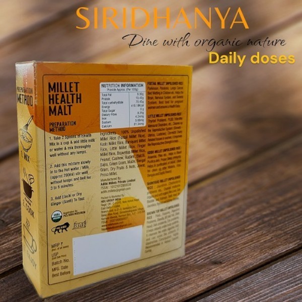 • Siridhanya millets malt With protein, dietary fibre and iron you cannot ask for a better start to the day of your family.