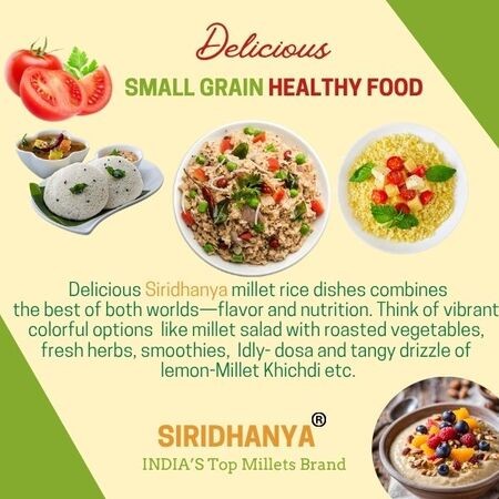· Super grains: Siridhanya is positive millets naturally improve how your body draws nourishment from food-making you feel fitter, lighter, and more energetic. It is great for health.
