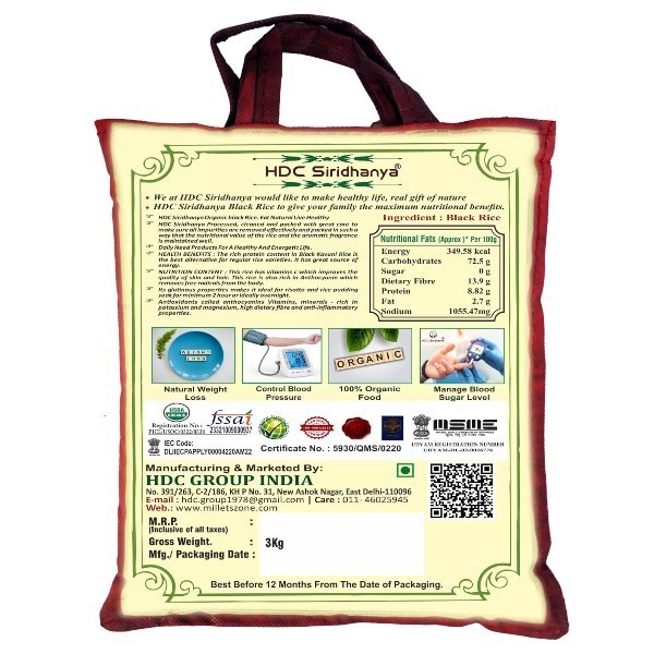 • HDC Siridhanya Organic black Rice. Eat Natural Live Healthy HDC Siridhanya Processed, cleaned and packed with great care to make sure all impurities are removed effectively and packed in such a way that the nutritional value of the rice and the aromatic fragrance is maintained well.